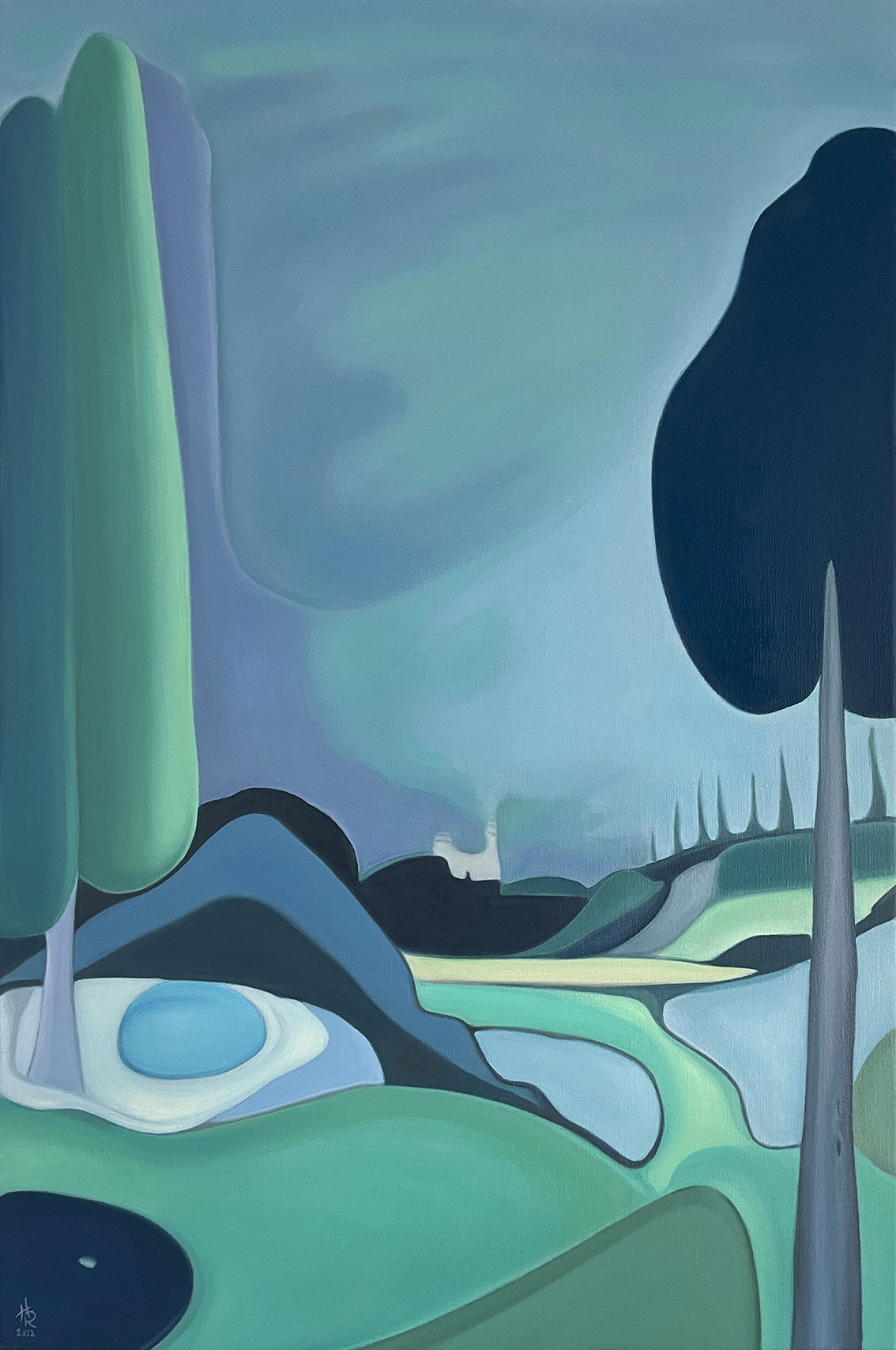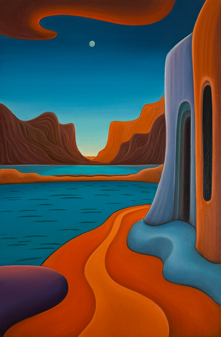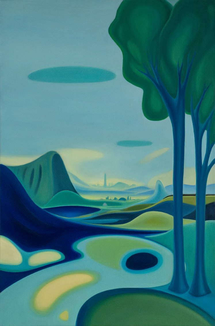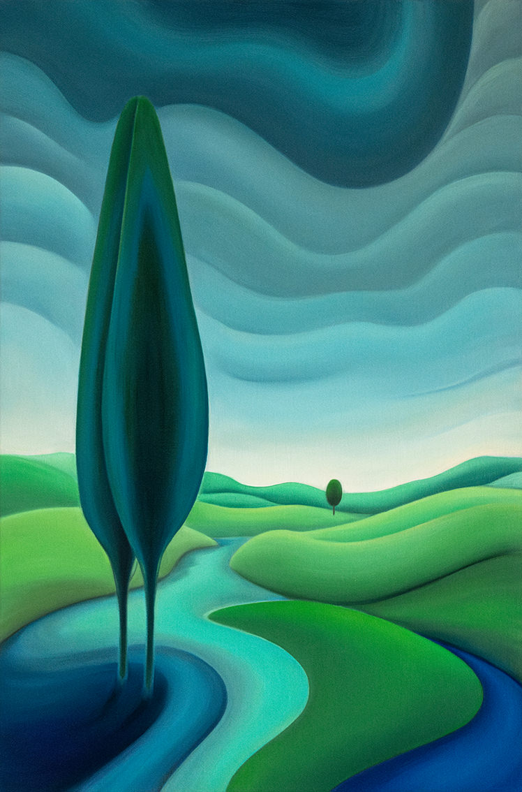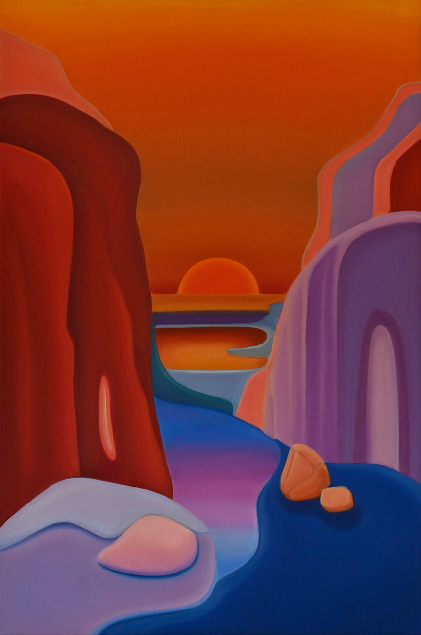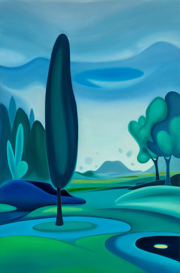 "Between Sky and Earth" is a series of oil on canvas paintings depicting minimalist landscapes in vibrant colors, designed to evoke calm, mental fortitude, and deep contemplation. In a world overwhelmed by stress, instant gratification, and conflict, these works offer a sanctuary -an escape from daily pressures into a peaceful, imaginary realm-. The flowing forms and vivid hues invite viewers to pause and reflect, providing a haven for the mind. Helena Revuelta, April 2024