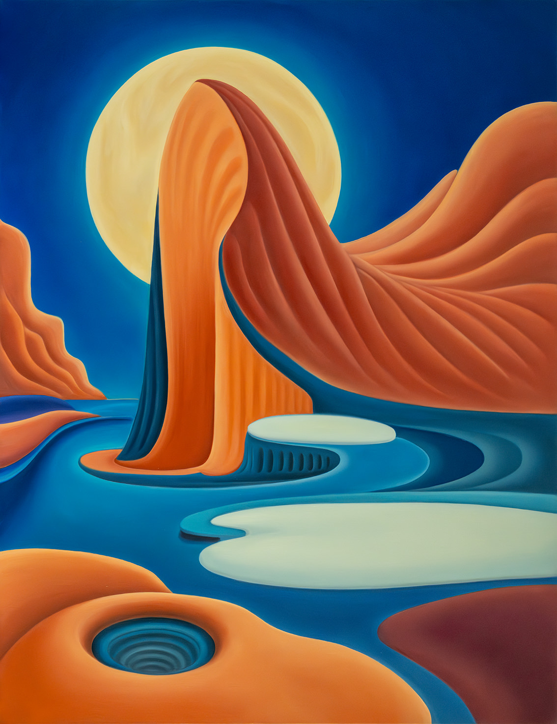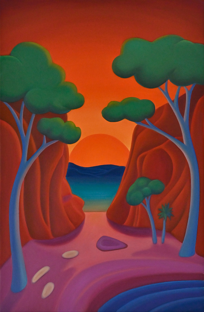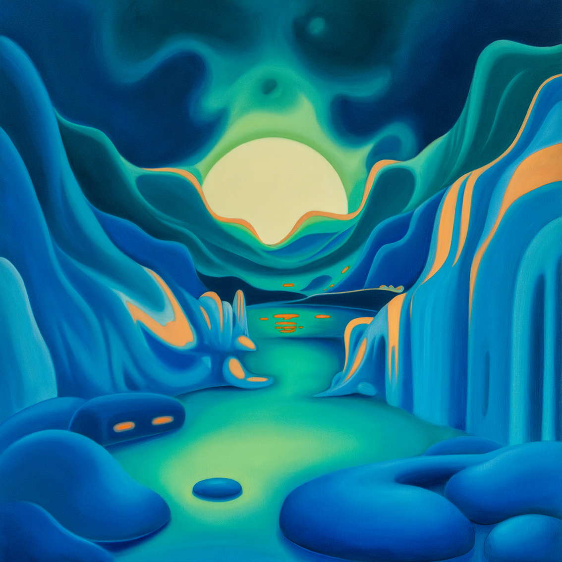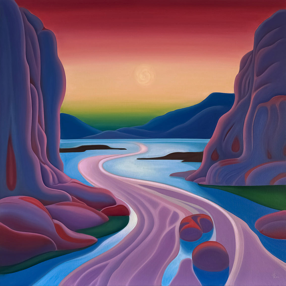 "Between Sky and Earth" is a series of oil on canvas paintings depicting minimalist landscapes in vibrant colors, designed to evoke calm, mental fortitude, and deep contemplation. In a world overwhelmed by stress, instant gratification, and conflict, these works offer a sanctuary -an escape from daily pressures into a peaceful, imaginary realm-. The flowing forms and vivid hues invite viewers to pause and reflect, providing a haven for the mind. Helena Revuelta, April 2024